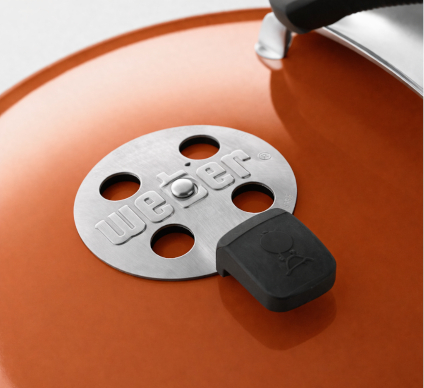 La tapa incorpora una válvula de ventilación de aluminio que permite regular de forma precisa el flujo de aire, facilitando el control de la temperatura durante la cocción y optimizando el rendimiento de la barbacoa.