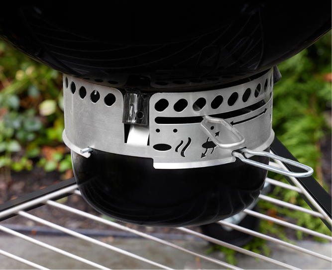 El regulador Rapidfire ofrece un control total de la temperatura. Su diseño con bisagra permite abrirlo completamente para maximizar el flujo de aire en el interior, generando un efecto chimenea que eleva la temperatura con rapidez y te permite comenzar a cocinar en cuestión de minutos.