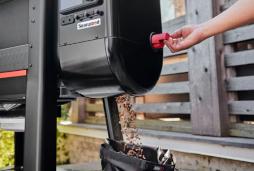 La tolva lateral está diseñada para facilitar la carga de pellets y tiene capacidad para alojar un saco estándar de 9 kg. Además, incorpora una práctica palanca de liberación que permite vaciar y cambiar fácilmente el tipo o sabor de los pellets según la receta que desees preparar.