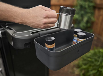 - Mesa lateral Weber Works, compatible con accesorios insertables opcionales, como cubetas con tapa, tablas de corte o kits de preparación y servicio, para cocinar con mayor comodidad.