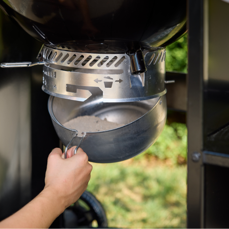 Sistema de limpieza One-Touch que permite retirar las cenizas de forma rápida y sin esfuerzo, recogiéndolas en un recipiente inferior para facilitar su vaciado y mantener la barbacoa siempre limpia