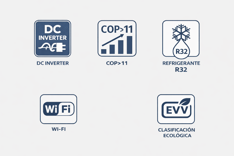 | COP promedio a 27°C | 10,2 - 5,8 | 10,6 - 5,7 | 10,8 - 5,8 | 11 - 6 | 10,8 - 5,7 |