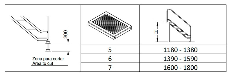 La escalera está diseñada para adaptarse a distintas profundidades de piscina, ofreciendo una solución versátil según el número de peldaños elegido. Está disponible en configuraciones de 5, 6 y 7 peldaños, lo que permite seleccionar el modelo más adecuado en función de la altura del vaso y las necesidades de la instalación.