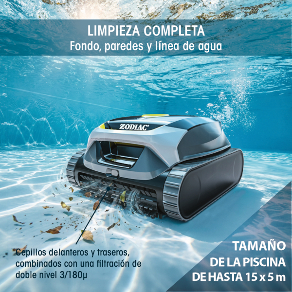 Limpia fondo, paredes y línea de flotación hasta 3 horas, combinando filtración avanzada y sensores inteligentes para una limpieza eficiente de la piscina.