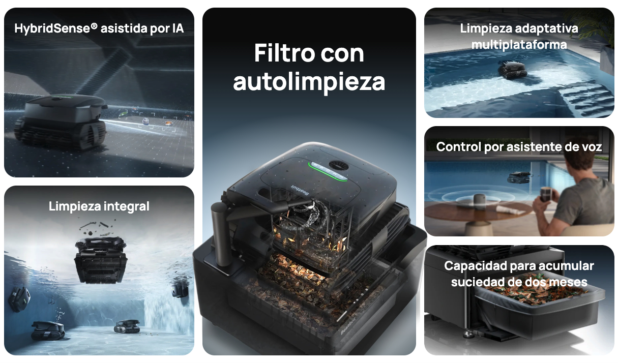 Gracias a la tecnología HybridSense AI, mapea la piscina, detecta la suciedad y optimiza las rutas de limpieza, logrando resultados hasta el doble de rápidos. Ofrece una limpieza completa de fondo, paredes, línea de flotación, superficies y zonas poco profundas desde 35 cm.